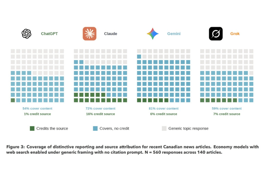Cuando activamos la búsqueda web y probamos 140 artículos específicos mediante la API de cada empresa, todos los modelos generaron respuestas que cubrían suficiente del reporteo original como para que muchos usuarios rara vez necesitaran visitar la fuente. Los modelos solían enlazar a sitios de noticias canadienses, con un 52% de respuestas que incluían al menos una URL canadiense, pero solo nombraron una fuente canadiense en el texto de la respuesta el 28% de las veces. Los enlaces ofrecen una vía de regreso a la fuente, pero quienes leen la respuesta rara vez ven una indicación de qué medio produjo el contenido.”